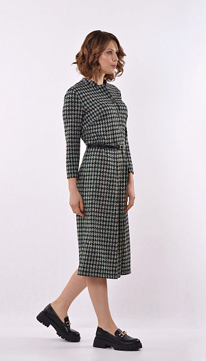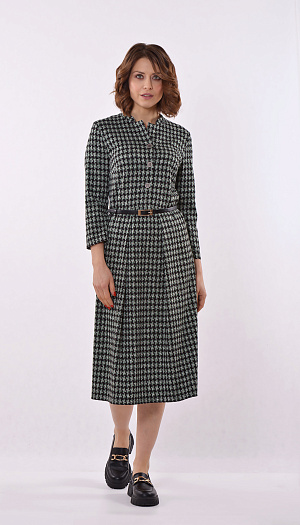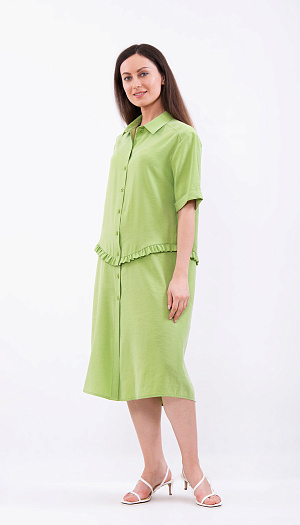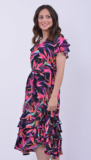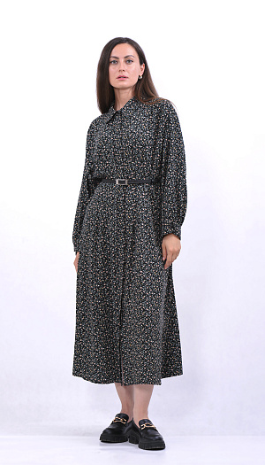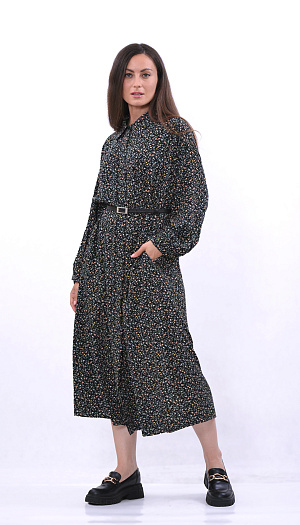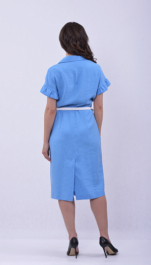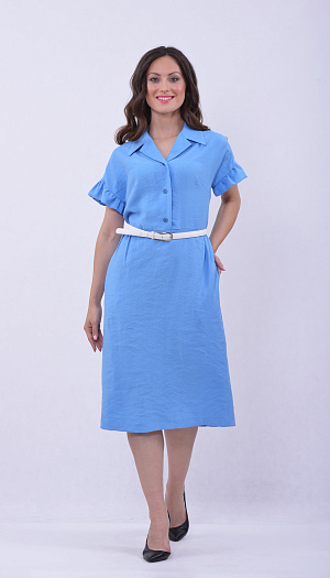 Платье-халат с застёжкой на пуговицах, с воланом , с длинным рукавом. Горловина и манжеты украшены рюшей. В боковых швах карманы. По талии пояс. Цвет:синий Cостав:80%вискоза 20%нейлон